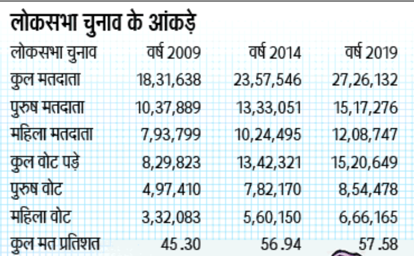 लोकसभा चुनाव-2024 में 29 लाख 38845 कुल मतदाता हैं। इनमें से पुरुष मतदाता 16,22,869 हैं और महिला मतदाता 13,15,872 हैं। महिलाओं का प्रतिशत हर लोकसभा चुनाव में पुरुषों के सापेक्ष अधिक बढ़ा है।