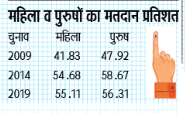 लोकसभा चुनाव 2009 के बाद से  महिलाओं को मतदान प्रतिशत भी बढ़ा है। 2009 में 41.83 प्रतिशत महिलाओं ने मतदान किया था। अगले लोकसभा चुनाव 2014 में 54.68 प्रतिशत व 2019 में 55.11 प्रतिशत महिलाओं ने मतदान किया। जबकि पुरुष मतदान 2014 में 58.68 व 2019 में घटकर 56.31 प्रतिशत रह गया।