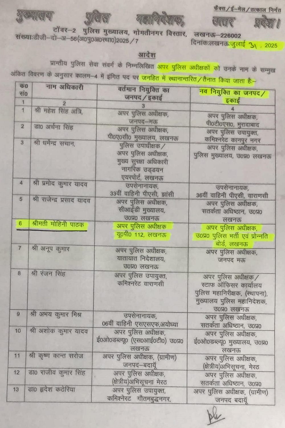 मोहिनी पाठक को अपर पुलिस अधीक्षक उत्तर प्रदेश पुलिस भर्ती एवं प्रोन्नति बोर्ड में तैनात किया गया है। अनूप कुमार को मऊ में अपर पुलिस अधीक्षक के पद पर तैनात किया गया है। रंजन सिंह को अपर पुलिस अधीक्षक/ स्टाफ ऑफिसर कार्यालय पुलिस महानिरीक्षक, (स्थापना), मुख्यालय पुलिस महानिदेशक, लखनऊ नियुक्त किया गया है। अभय कुमार मिश्र को अपर पुलिस अधीक्षक, सतर्कता प्रतिष्ठान में तैनाती दी गई है। अशोक कुमार यादव को अपर पुलिस अधीक्षक, ईओडब्ल्यू मुख्यालय लखनऊ में नियुक्त किया गया है। कृष्ण कांत सरोज को अपर पुलिस अधीक्षक (अभिसूचना), मेरठ नियुक्त किया गया है।