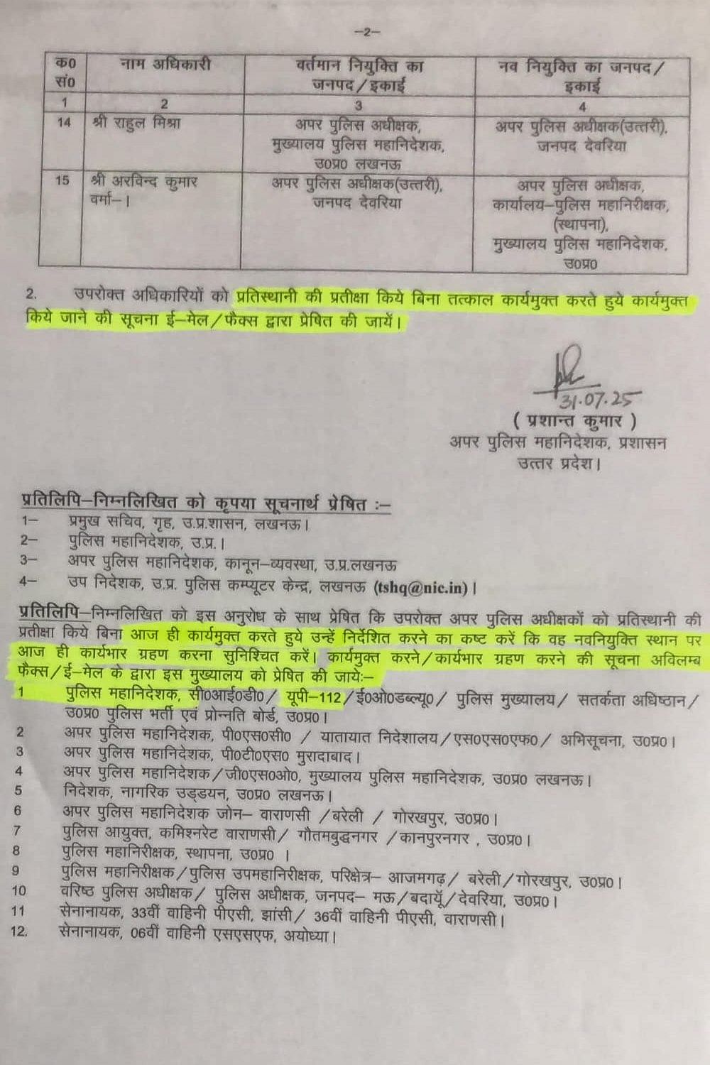 राहुल मिश्रा को देवरिया में अपर पुलिस अधीक्षक (उत्तरी) के पद पर तैनाती दी गई है। अरविंद कुमार को अपर पुलिस अधीक्षक, कार्यालय – पुलिस महानिरीक्षक (स्थापना), मुख्यालय पुलिस महानिदेशक के पद पर तैनात किया गया है।